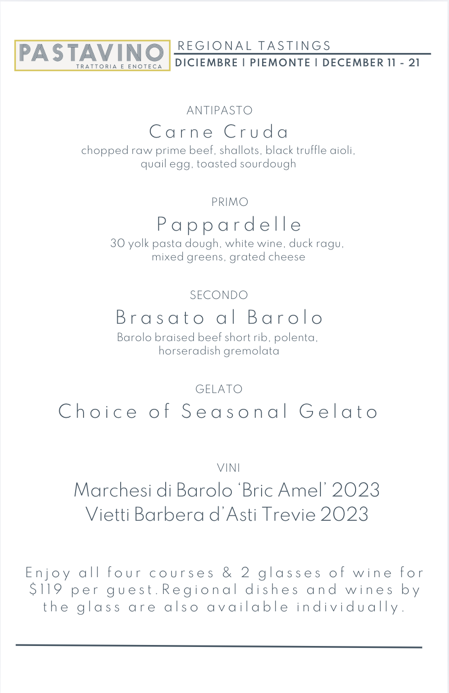 A tour that will showcase an antipasto, pasta, entree, and gelato flavor as well as two wines by the glass and several by the bottle from each region, available for 10 days a month at Pastavino!