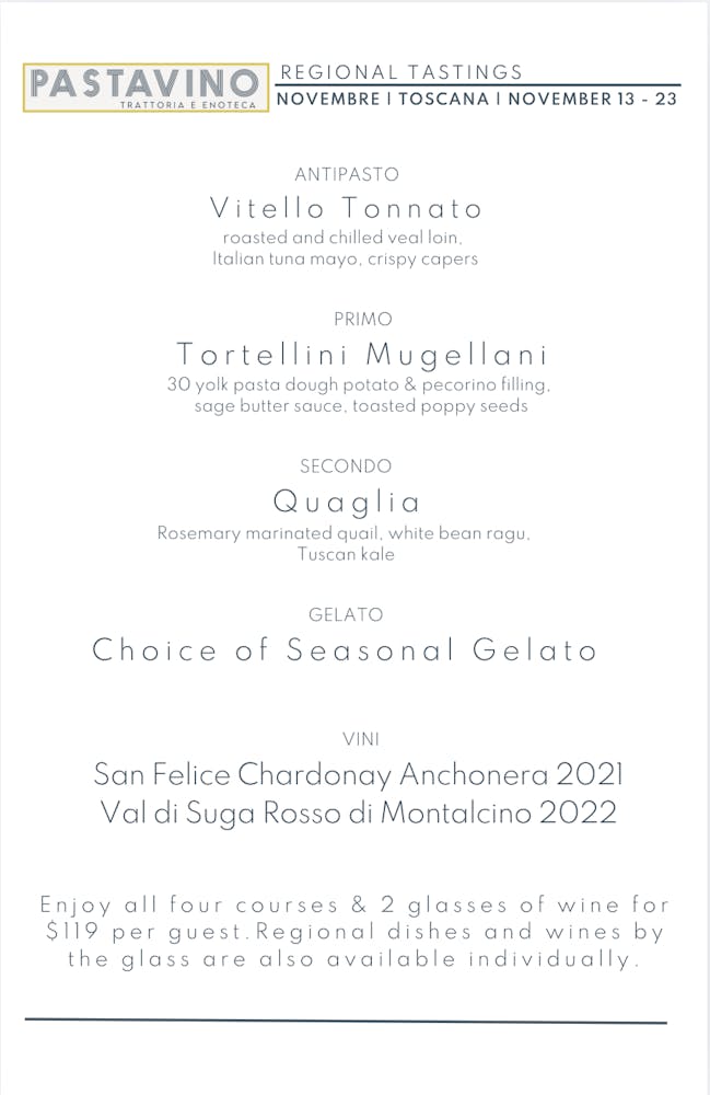 A tour that will showcase an antipasto, pasta, entree, and gelato flavor as well as two wines by the glass and several by the bottle from each region, available for 10 days a month at Pastavino!